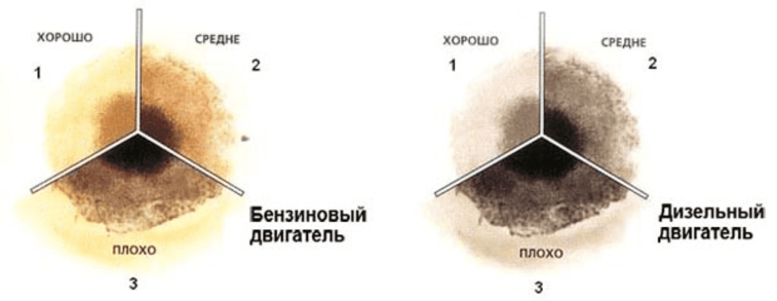 Потім пляму залишають висихати до повного всмоктування. Для цього вистачає приблизно 15 хвилин. Повинна залишитися світла і рівномірна пляма. Якщо помітні розлучення, нерівномірне висихання, засохлі крупинки, то якість складу не відповідає нормі. Необхідно злити масло повністю, замінити фільтр та залити нове.