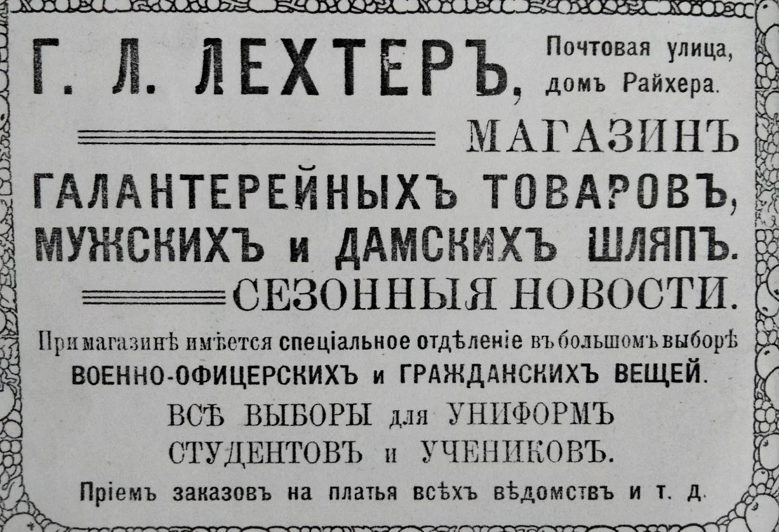Магазин галантерейних товарів Г. Л. Лехтер. Пропонують чоловічі і жіночі капелюхи.