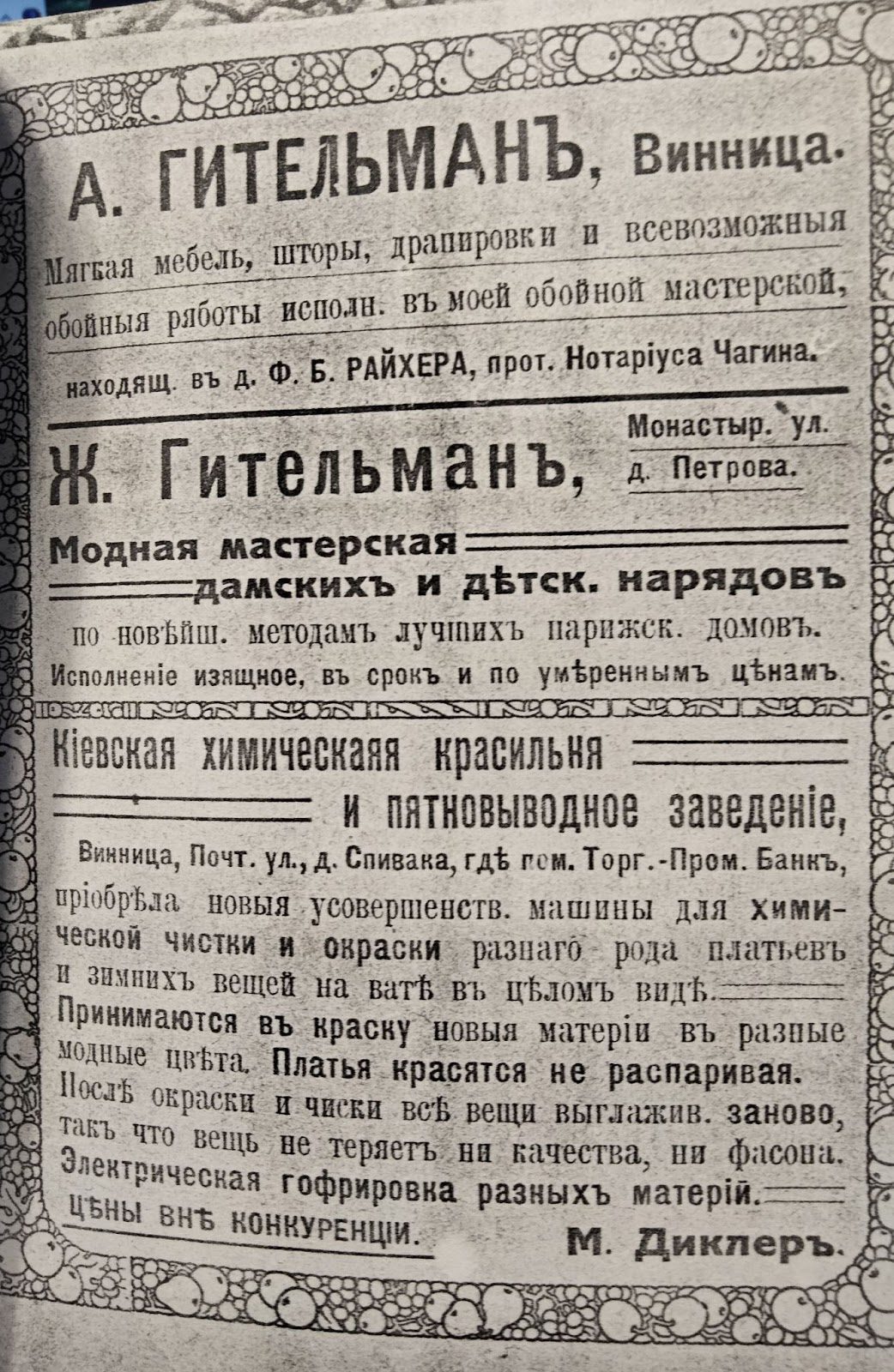 Пан А. Гітельман, текстильний майстер, пропонує свої послуги: виробництво м’яких меблів, штор, драпірування, шпалери (раніше шпалери були з тканини).
