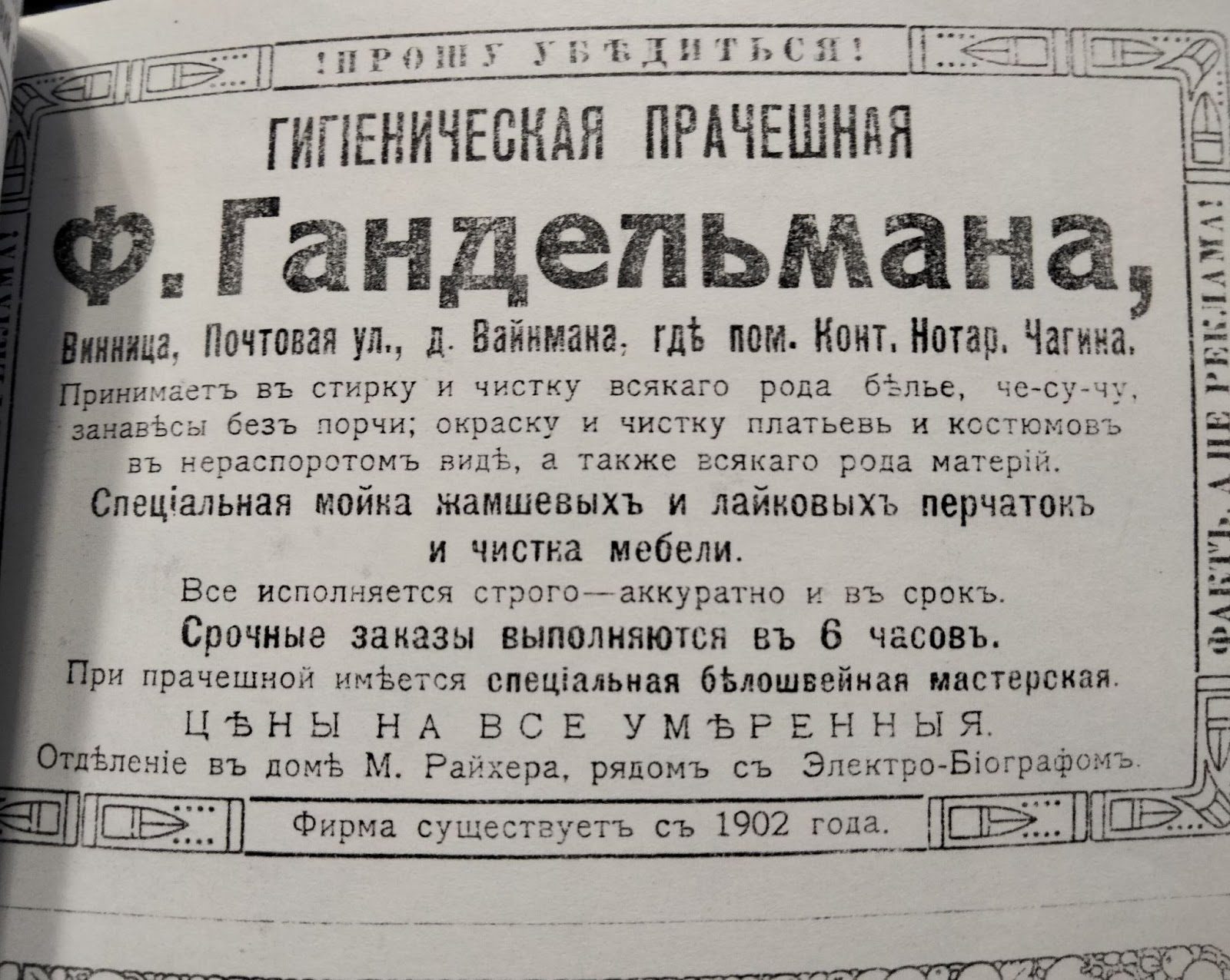 Гігієнічна пральня Ф. Гандельмана приймає для прання білизну, че-су-чу (вироби з щільного шовку), фіранки (без дефектів).