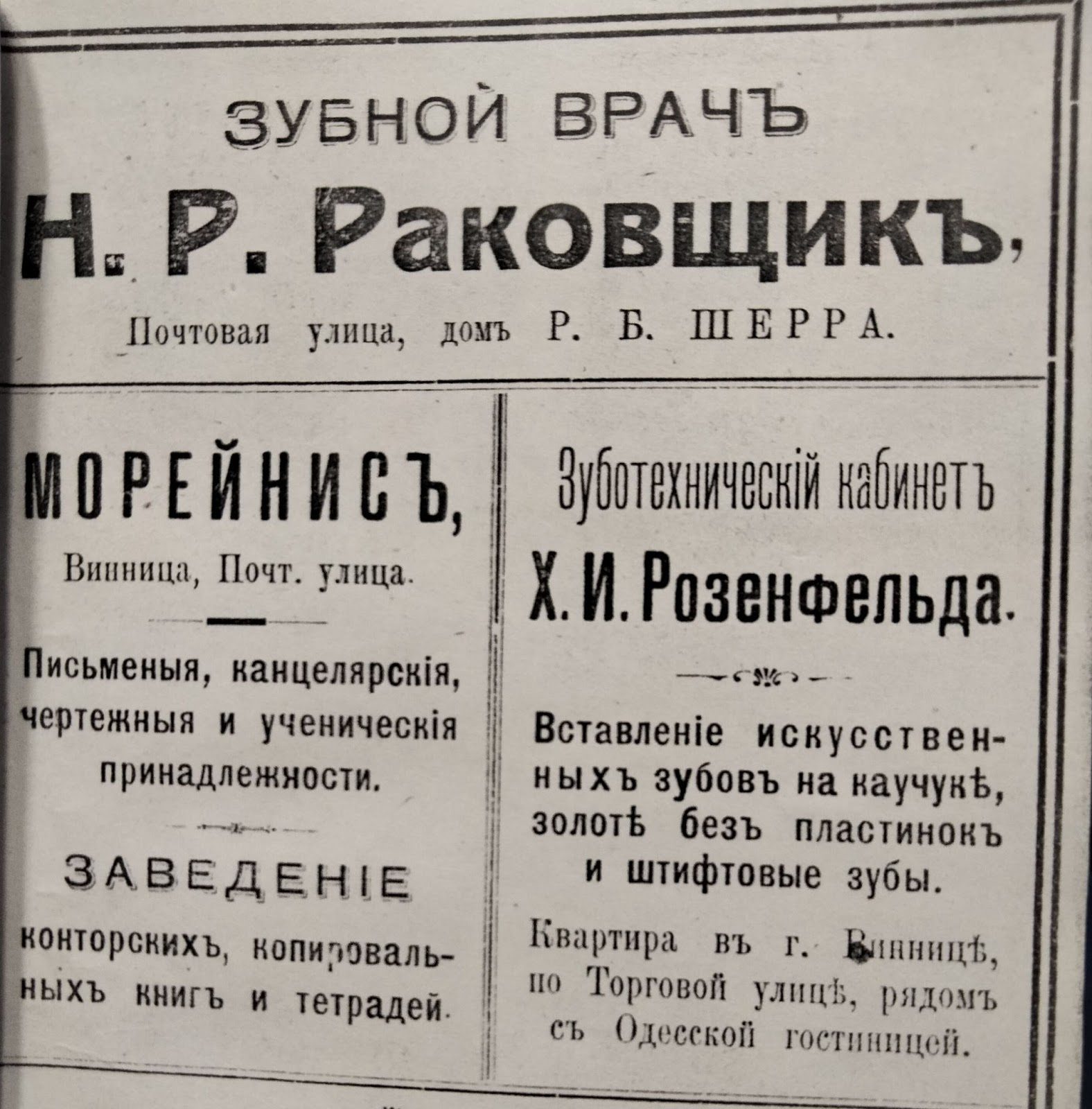 Зубний лікар Н.Р. Раковщик приймає за адресою Поштова вул. (Соборна) будинок Р.Б. Шерра