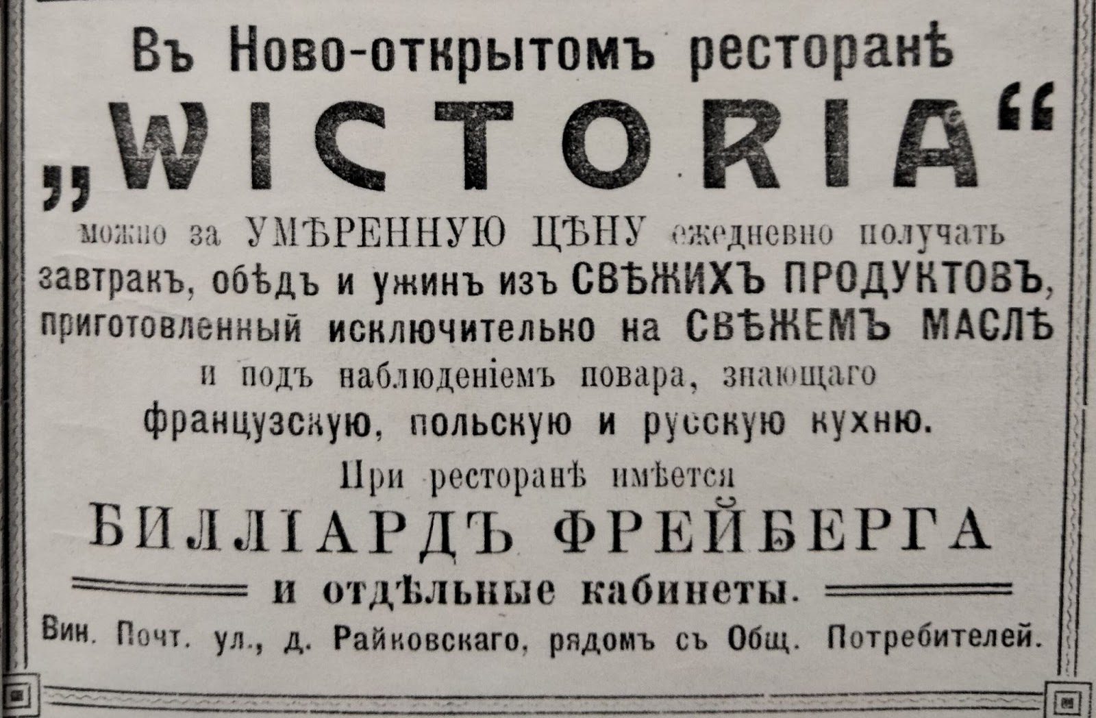 Новомодний ресторан “Wictoria” пропонує за помірними цінами кожного дня отримувати сніданок, обід і вечерю з свіжих продуктів і на свіжій олії. Готують страви під наглядом кухаря, знавця французької, польської і російської кухні.