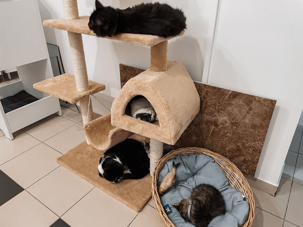 Котики можуть вільно пересуваються залами, від відвідувачів вони отримують достатньо уваги та спілкування, а на ніч пухнастиків залишають у спеціально призначених для них будинків в окремій кімнаті.